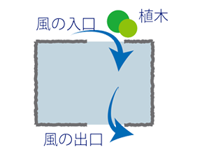 風向きを考慮しながら、窓外に中木の植木を置くことで、