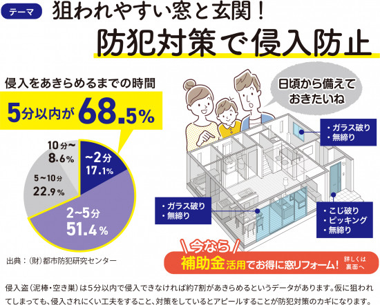 - 補助金活用のチャンス!お得な窓リフォームで、夏の暑さや冬の寒さだけでなく、ご家族の安全も守る防犯対策を同時に実現しましょう。