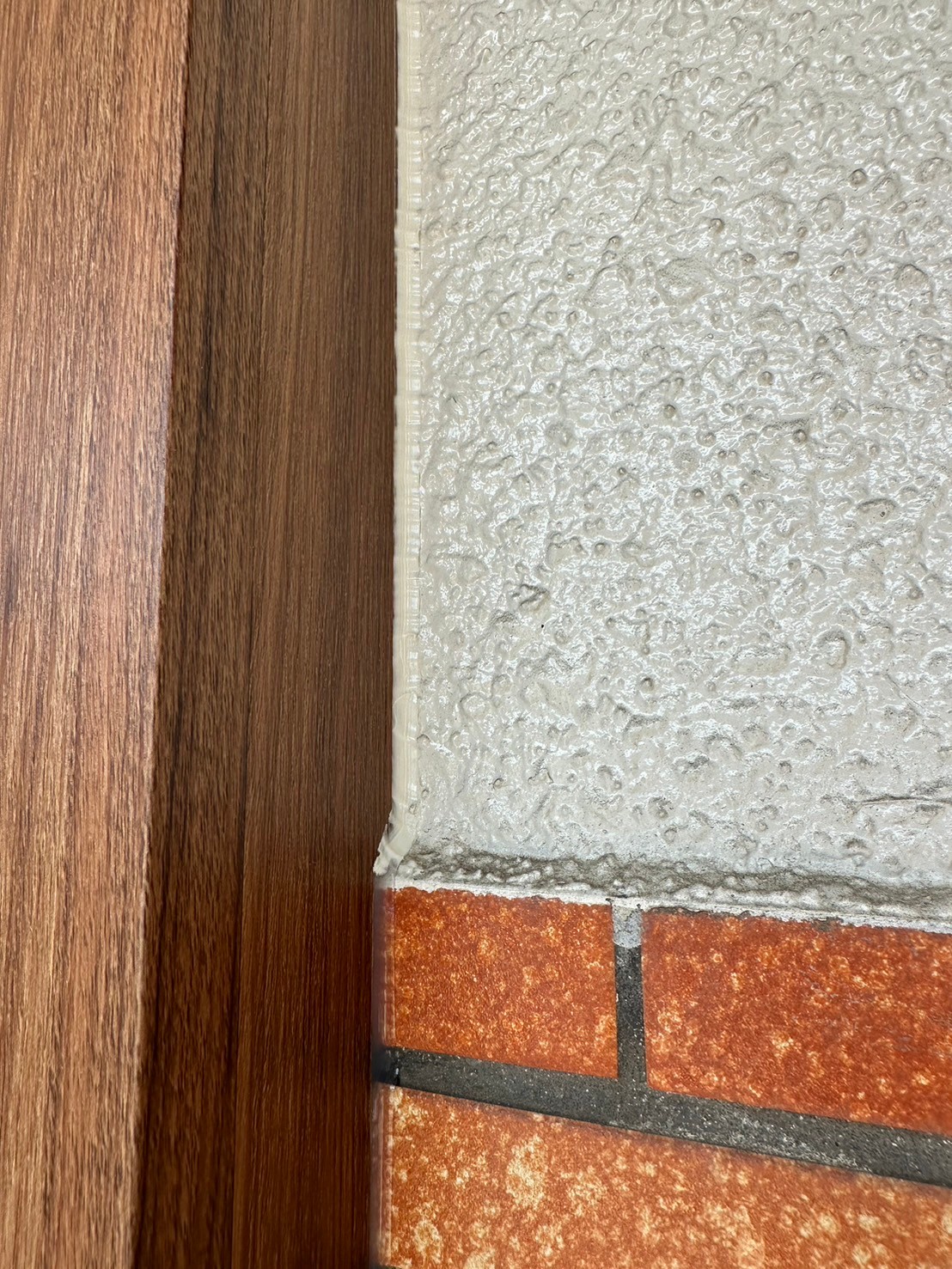 また外壁に合わせるためコーキングを上部はホワイト系、下部のタイル地のところはクリアのコーキングにしました。