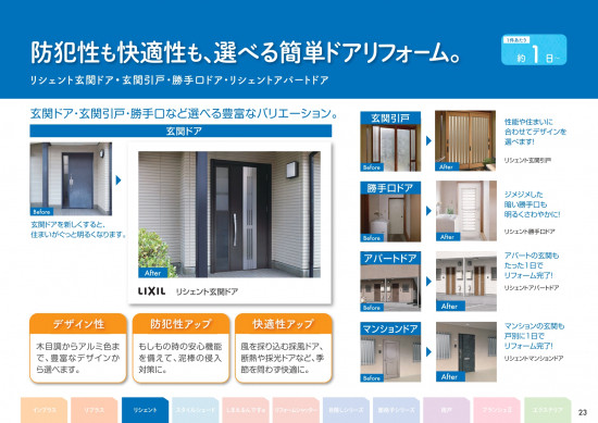 - 標準ドアより手前に開くスペースが少ない中折れドアや軽い力で開閉できる引戸、閉める時に自動的に減速する安全なドアなどにリフォームすれば家のお悩みを解決できます。