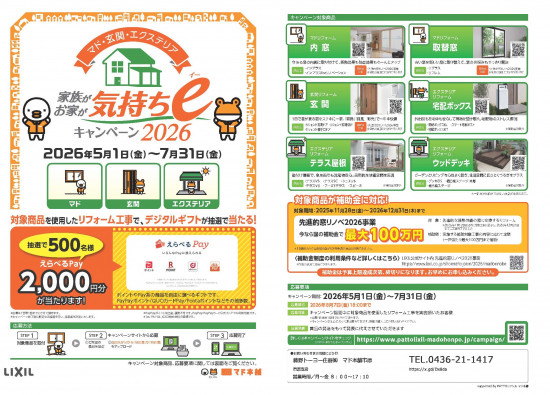 - マド本舗2026春キャンペーン「家族がお家が気持ちeキャンペーン2026」が5月1日(金)から始まります。 期間中に、対象商品の工事をしエントリーして頂くと抽選でデジタルギフトがもらえます!