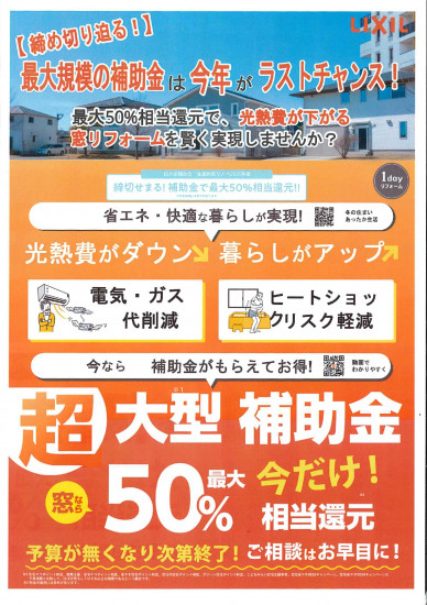 - 超大型補助金★窓なら最大50%相当還元