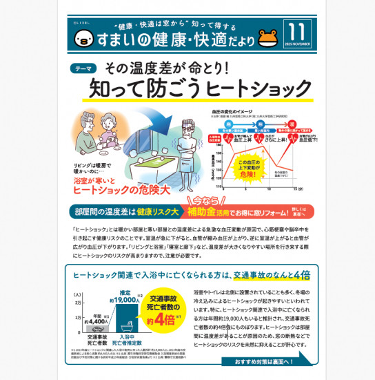 - 「ヒートショック」とは暖かい部屋と寒い部屋との温度差による急激な血圧変動が原因で、心筋梗塞や脳卒中を引き起こす建工リスクのことです。