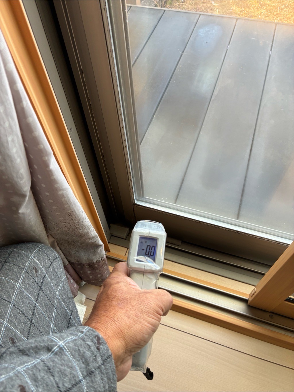 今年1月2日のインプラスの状況です、雪が降った日です外気はマイナスサッシと内窓の間も下の部分はマイナスですエアコンは20度設定で壁の温度は14度インプラスと真空ガラスも14度で壁と同じでした!室内温度は21度となっておりました。