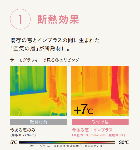 既存の窓と内窓の間で空気の層ができるため、圧倒的な断熱効果が期待できます。