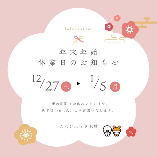 - 2025年12月27日(土)〜2026年1月5日(月)まで 年末年始休業とさせていただきます