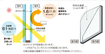 特殊金属膜を室内側のガラスに施すことで、一般複層ガラスと比較して