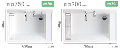 洗面本体の間口サイズ(幅)が大きくなると、ボウルサイズは変わりませんがボウル両側のカウンターが広くなるのも特長です。