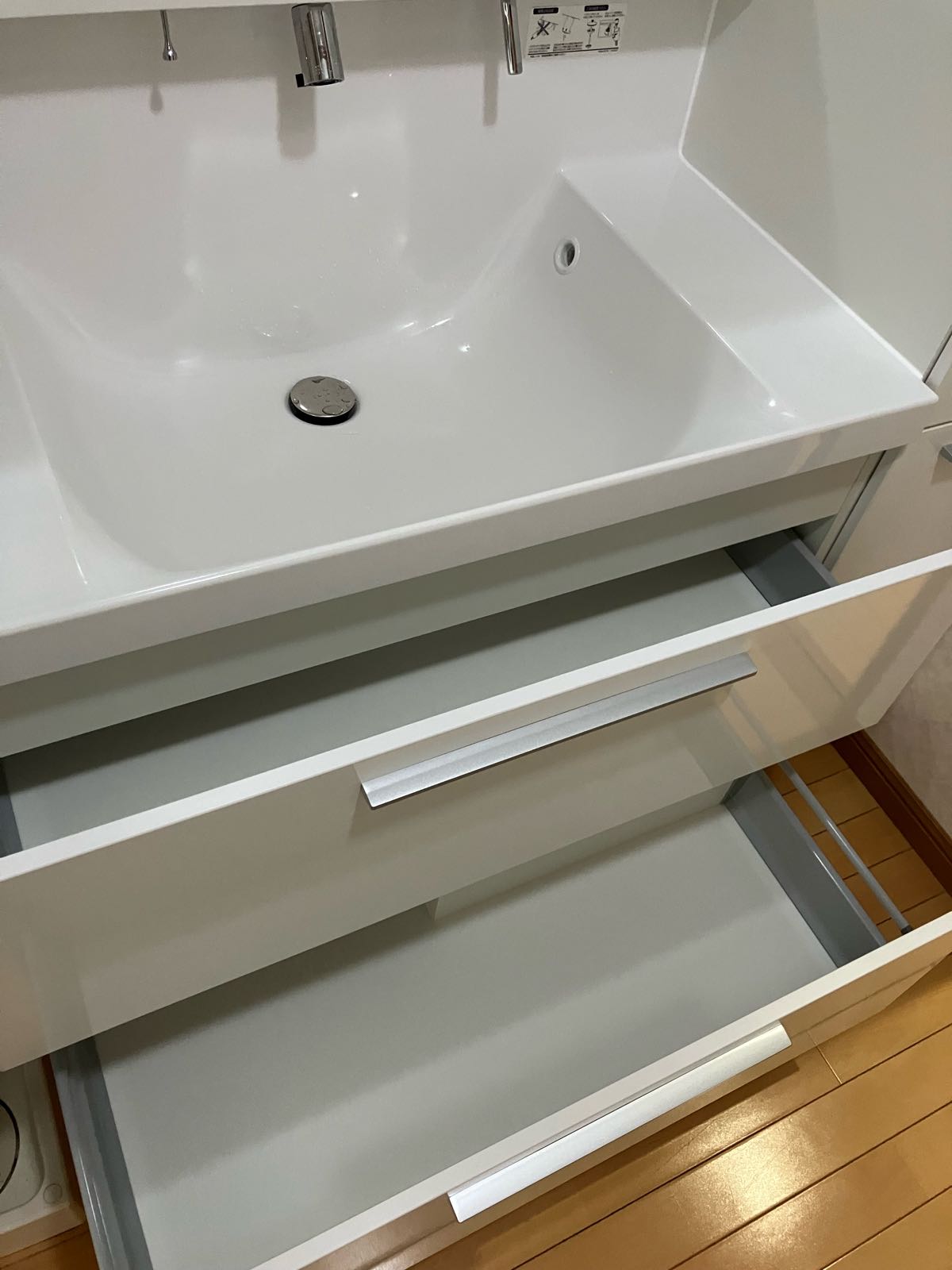 古くなった洗面化粧台を交換。収納力アップと掃除のしやすさで、明るく快適な洗面空間に生まれ変わりました。
