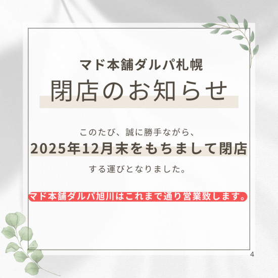 - マド本舗ダルパ札幌は、誠に勝手ながら、2025年12月末日をもちまして、閉店いたします。