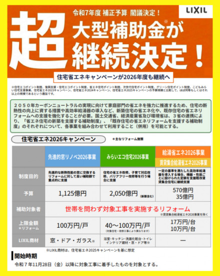 - 【速報】先進的窓リノベ2026が閣議決定!窓・玄関リフォームに最大100万円の補助