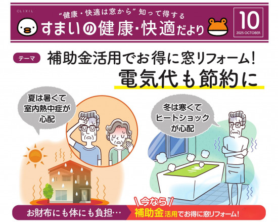 - 夏は暑く、冬は寒い…そんなお悩みを解消するには「窓の断熱リフォーム」がおすすめ! 今なら補助金を活用して、お得に快適な住まいへリフォームできます✨ ― すまいの健康・快適だより 10月号 ―