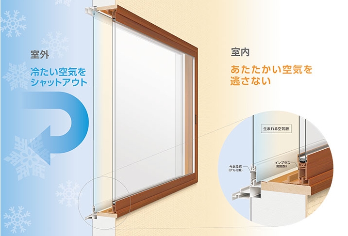 今ある窓とインプラスの間にうまれる「空気の層」が断熱材になります!