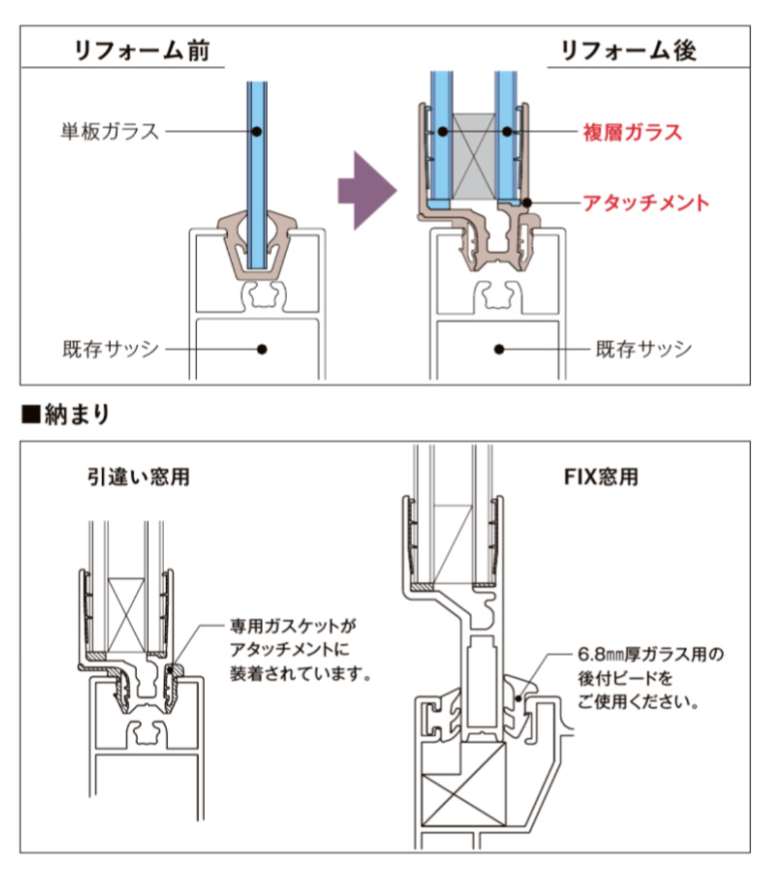 既存のサッシをそのまま使い、ガラスの交換だけでリフォームできるアタッチメントPG。既存のサッシにアタッチメントを付設し、従来の単板ガラスを高機能の複層ガラスに簡単リフォーム。引違い窓用・FIX窓用のどちらの納まりにも対応可能です。