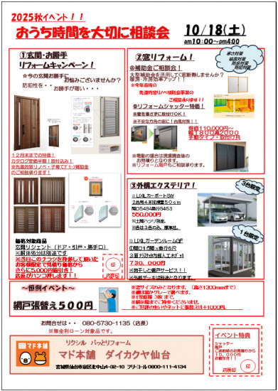 - 10/18(土)10:00~16:00まで泉区北中山にて【おうち時間を大切にご相談会】を開催いたします。大型補助金大詰めです!!!まだ間に合います!!!是非お気軽にお越しください♪