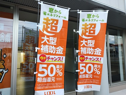 - 本社前に「省エネ補助金」のぼりを設置しました。