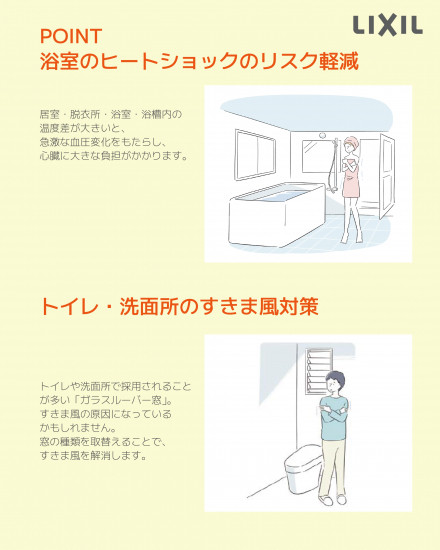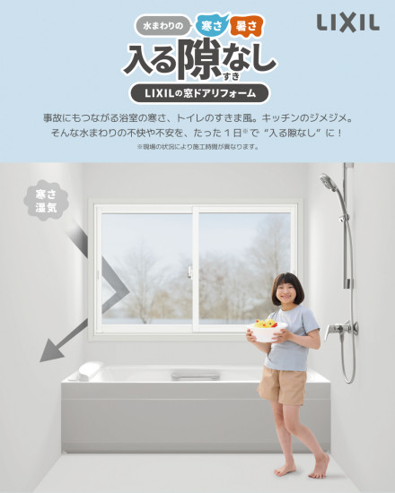 - LIXILの「インプラス(内窓)」「リプラス(窓交換)」で、 水まわりに入り込む“寒さの侵入口”を塞ぎ、暖房効率を2倍にする断熱リフォームです。
