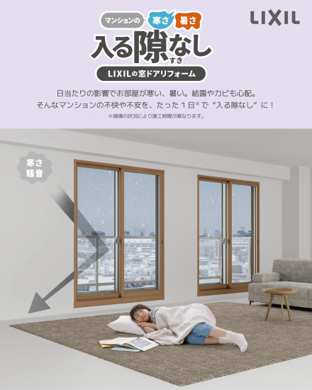 - LIXIL「インプラス(内窓)」と「リプラス(窓交換)」で、結露を根本的に防ぎ、カビを発生させない冬の断熱リフォームです。