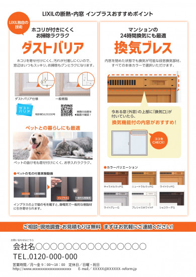 - LIXIL独自の「ダストバリア」技術でホコリを寄せ付けず、お掃除が驚くほど簡単に。マンションの24時間換気にも対応した「換気ブレス」なら、内窓を閉めたまま空気の入れ替えも可能。断熱と清潔を両立します。