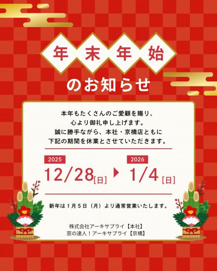 - 年末年始の営業日程につきまして、下記の通りご案内申し上げます。 お客様にはご不便をおかけいたしますが、何卒ご理解賜りますようお願い申し上げます。