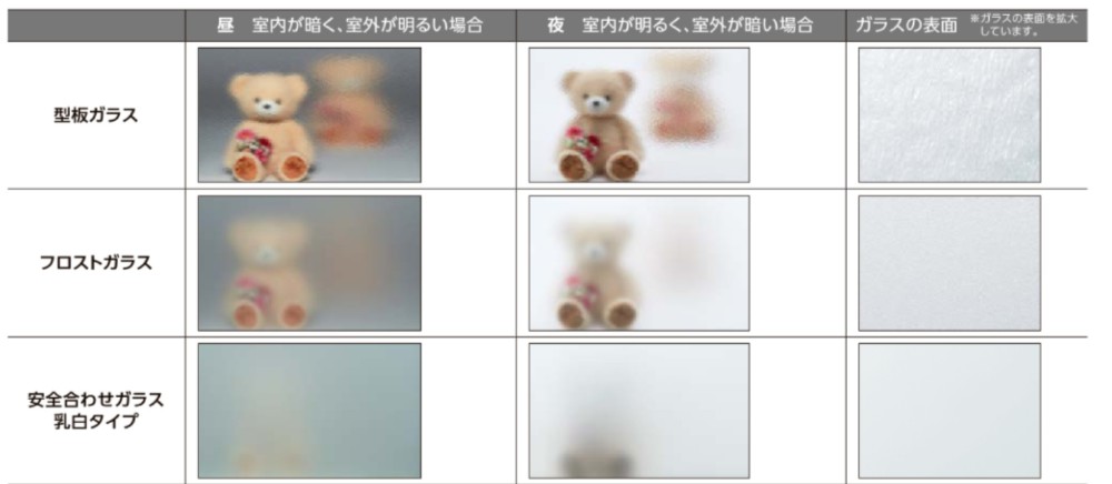 防犯性も兼ね備えた「安全合わせガラス(乳白タイプ)」もラインナップ。