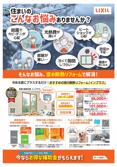 - 冬の寒さ、結露、ヒートショック対策などなど…住まいのお悩みを、インプラスで解決しませんか? 今ある窓に付けるだけで断然変わります!!お気軽にご相談ください!