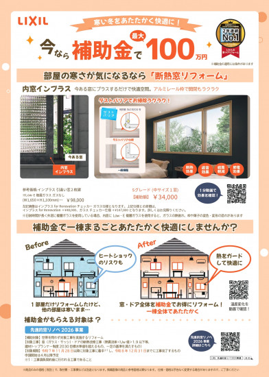 - 断熱・遮音・結露軽減など実感いただいた効果を、家中すべての部屋に。内窓インプラスと取替窓リプラスの2商品で、快適な住まいをまるごと実現します。補助金は最大100万円。