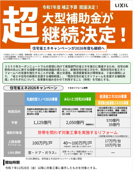 - 新年明けましておめでとうございます。2026年も省エネキャンペーン補助金でお得に窓リフォーム。