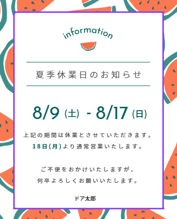 - ドア太郎のお休み期間 8月9日から8月17日までお休みします。