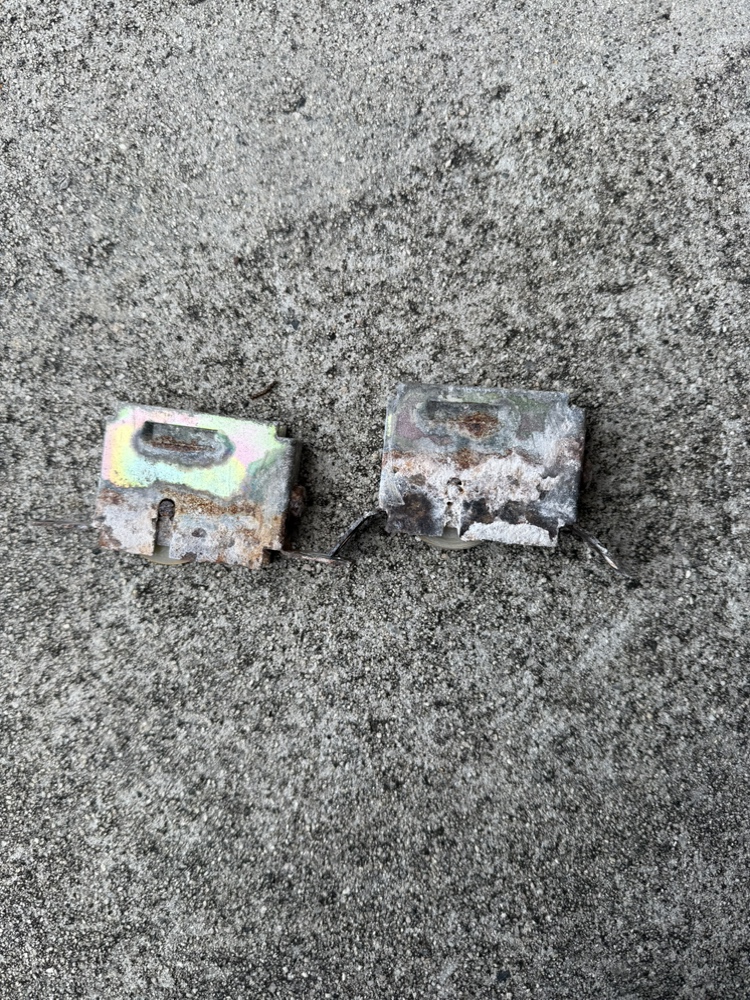 動きが悪く、原因を捜索するために扉をひっくり返してみると戸車がこのようにサビていました。