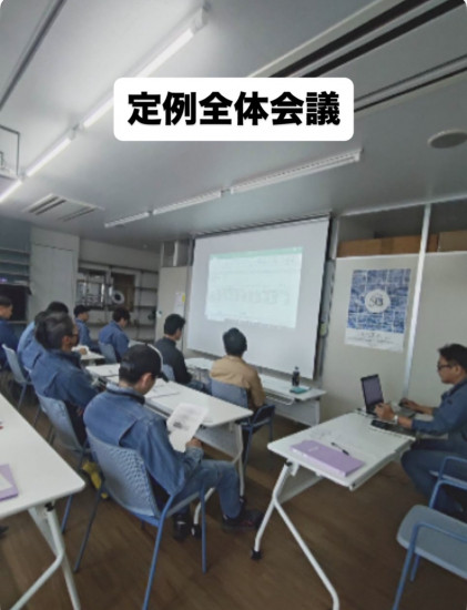 - 月末定例の全体会議の様子になります。よりよい会社を目指してみんなの表情も真剣です!