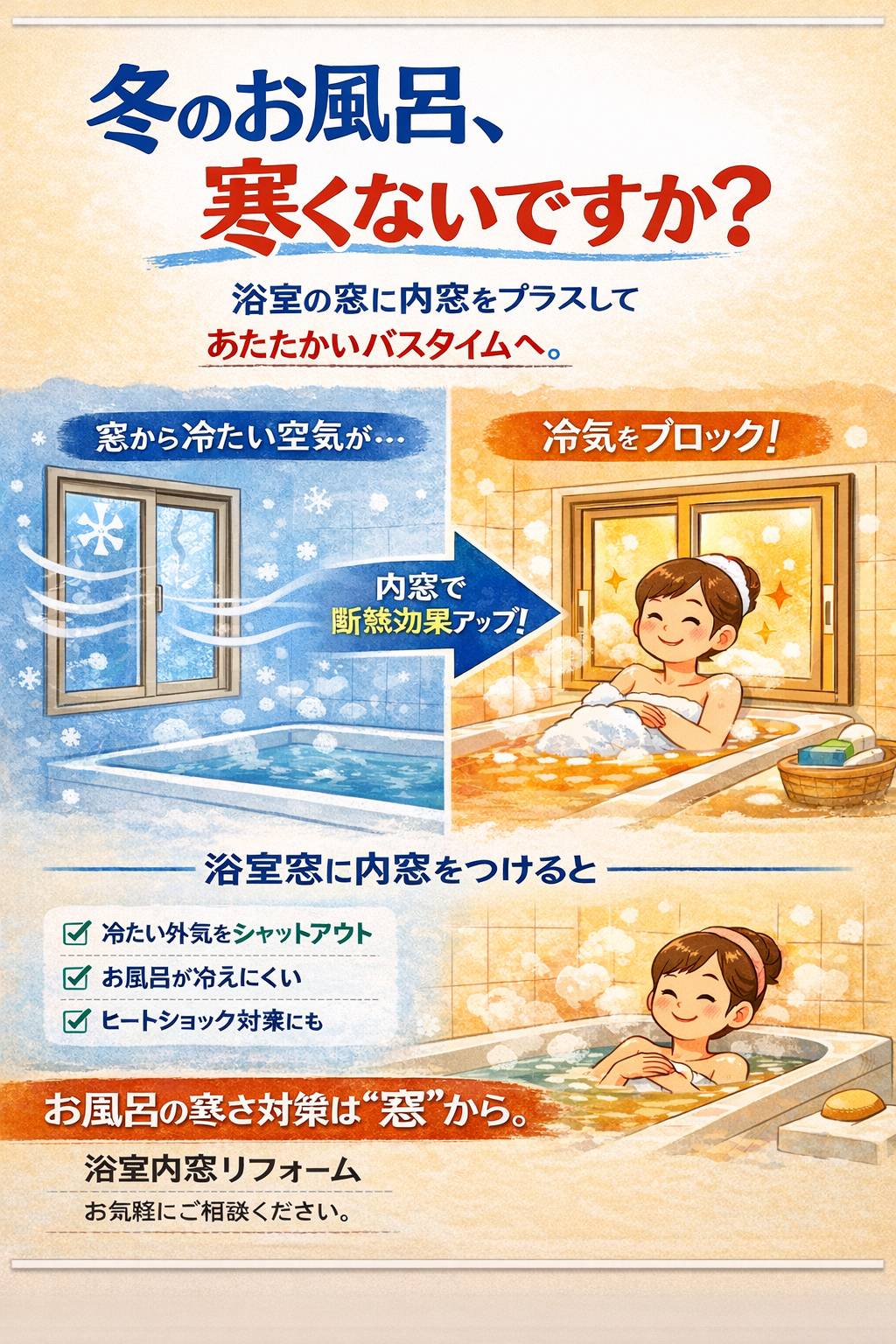 お風呂が寒い原因は“窓”かもしれません。窓を二重にしてあたたかいお風呂にしましょう😊