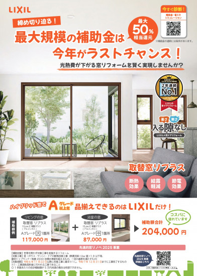 - 最大50%相当還元で、光熱費が下がる窓リフォームをかしこく実現しませんか? 予算が無くなり次第終了!ご相談はお早めに!