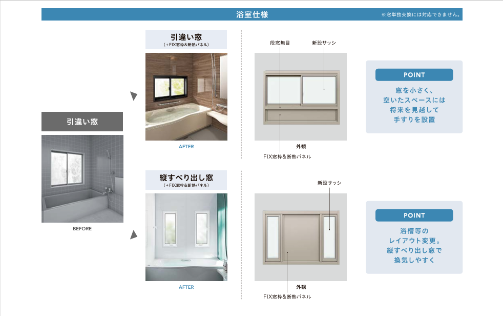 【採用商品】リプラス浴室 引違い窓 ブリッジ枠 2枚建 同時くり抜き縮小上窓 ブラック/ プレシャスホワイト色