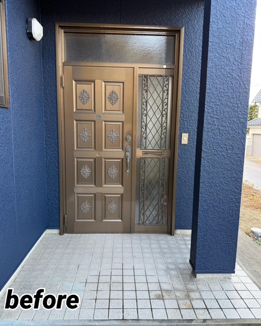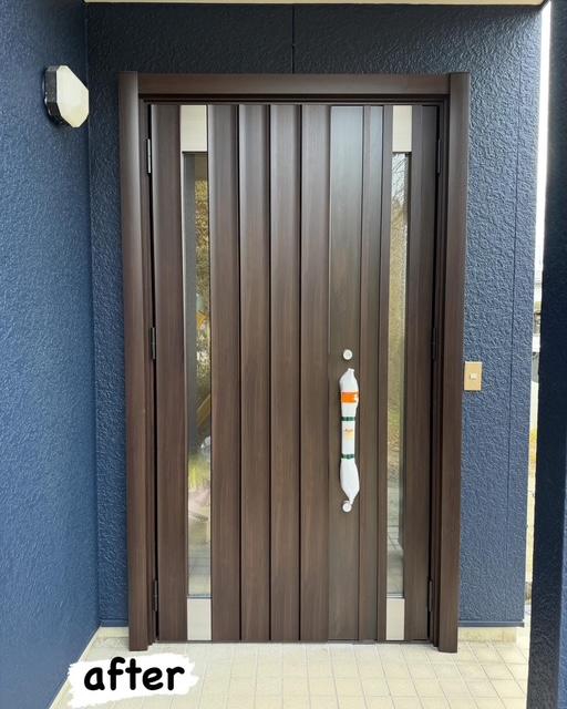 今回は玄関ドアのリニューアル工事をさせていただきました。 リクシル リシェント玄関ドアを採用しカバー工法での施工で工期も約1日で完成します。