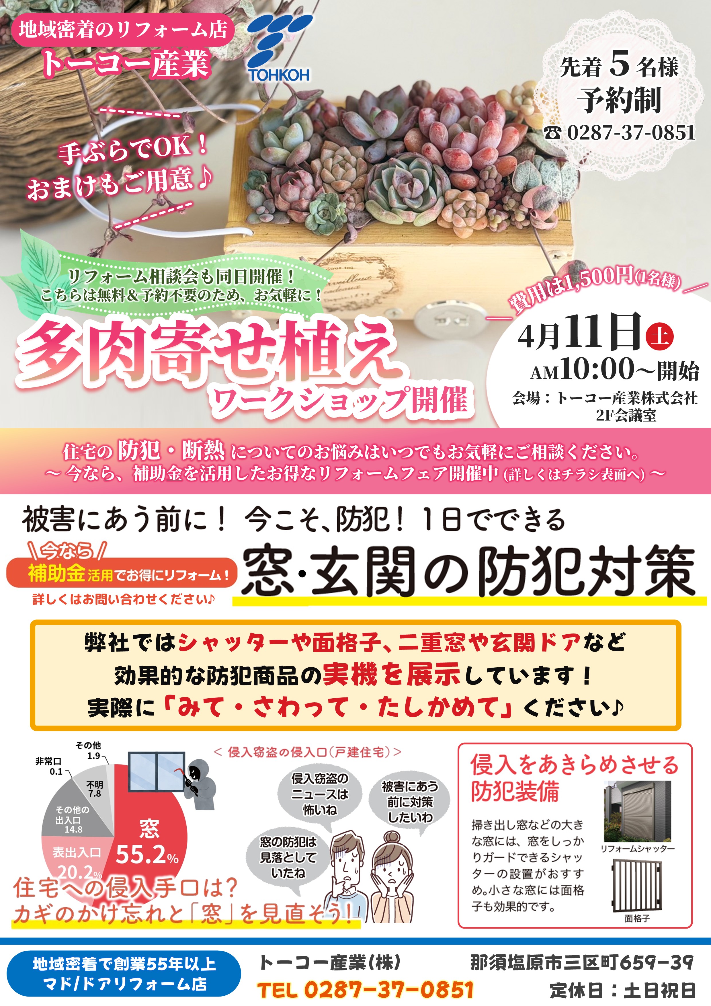 補助金早割!内窓の製品代50%OFFキャンペーン♪さらに、4月11日(土)は多肉植物寄せ植えワークショップを開催!無料見積で日用品の詰め合わせをもれなくプレゼント♪🎁