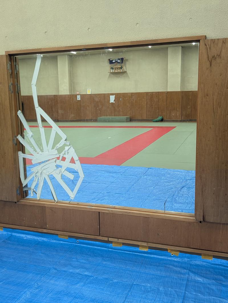 柔道場の鏡が物をぶつけて割ってしまったそうです。