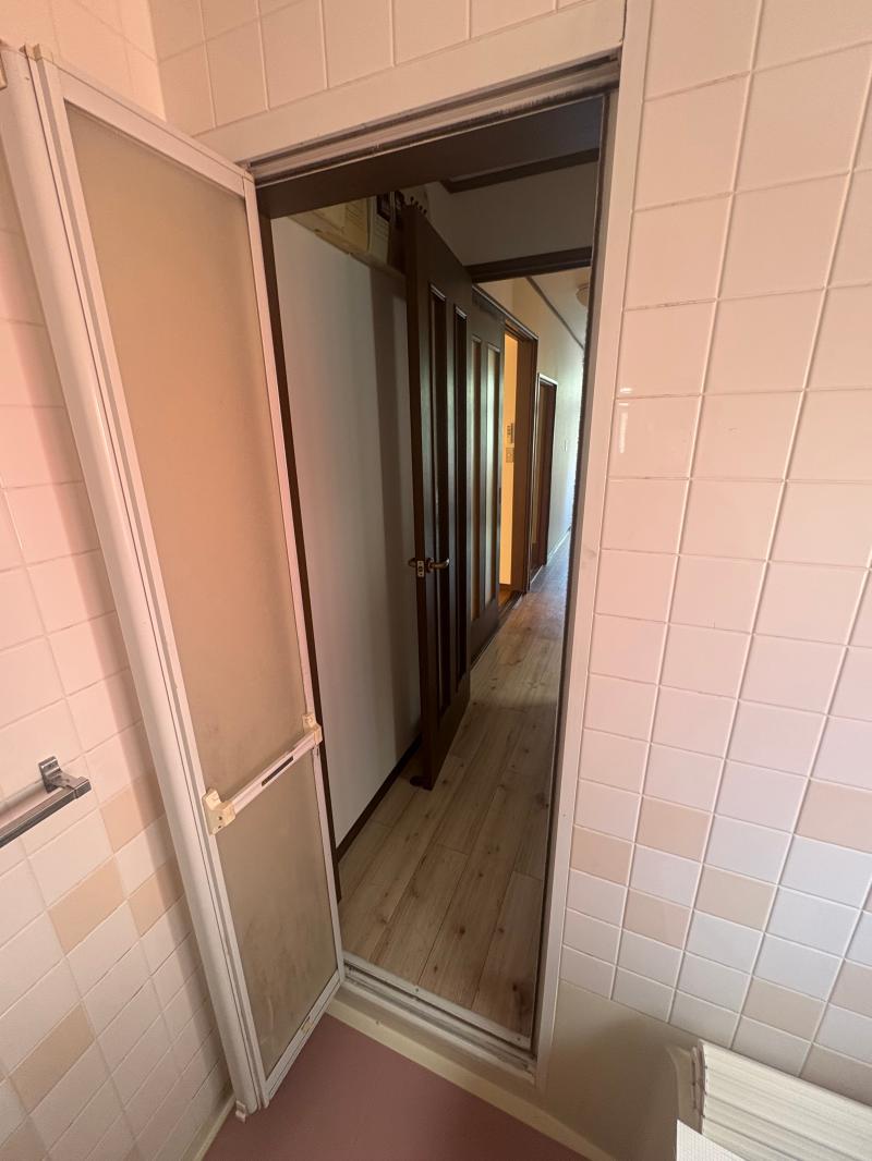 既存の浴室折れ戸は下レールが壊れてしまっていたので外れていて、