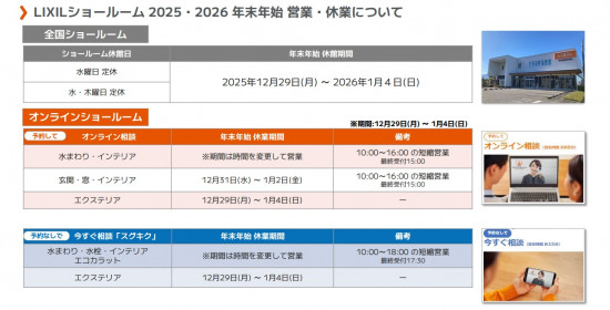 - 今年もお世話になりました。弊社年末年始12/27(土)~1/4(日)になります。LIXILショールーム年末年始休業お気を付けください。