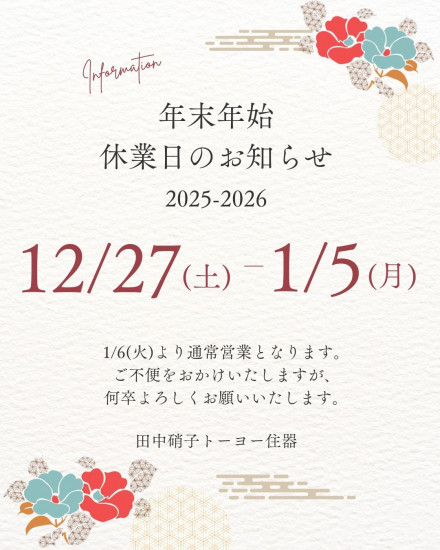 - 年末年始 休業日のお知らせ