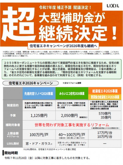 - 窓リフォームの超大型補助金【先進的窓リノベ】が来年も継続決定です 省エネキャンペーン2026!の予算が閣議決定されました