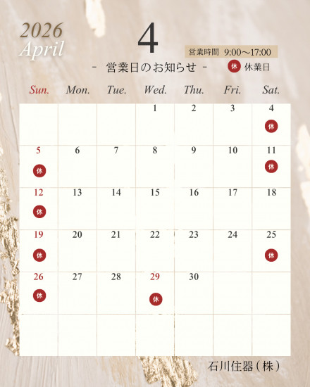 - 4月 営業日のお知らせ【カレンダー】